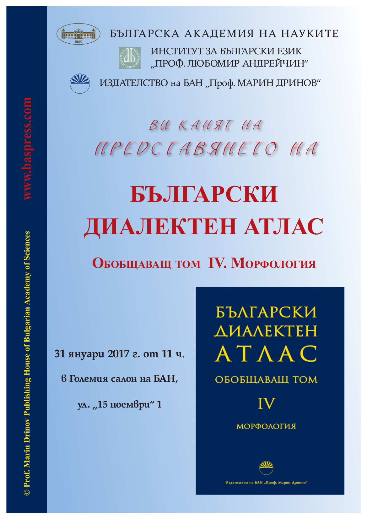 The Institute for Bulgarian Language would like to invite colleagues and the wide public to the presentation of the Bulgarian Dialect Atlas. Review. Vol. IV. Morphology, Sofia, 2016, Prof. Marin Drinov Academic Publishing.