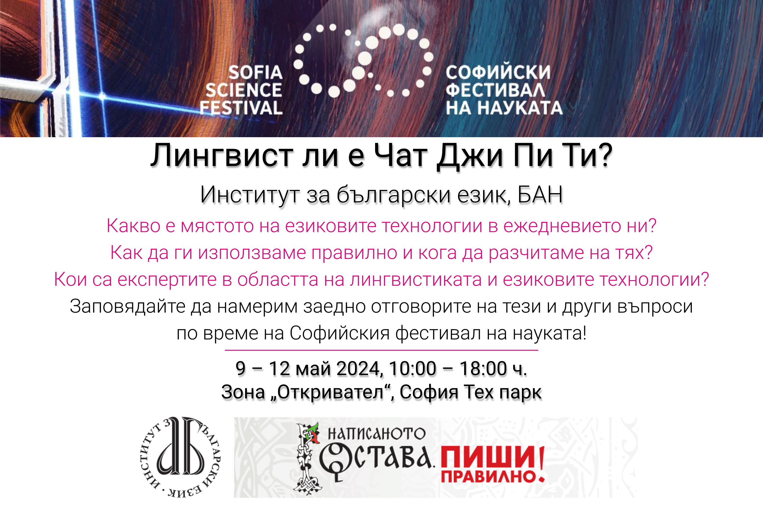 Институтът за български език при Българската академия на науките ще вземе участие в Софийския фестивал на науката от 9 до 12 май 2024 г. от 10 до 18 ч. в Зона „Откривател“, София Тех парк. Темата на демонстрациите и дискусиите е: „Лингвист ли е Чат Джи Пи Ти?“, а фокусът им ще бъде към следните въпроси: какво е мястото на езиковите технологии в ежедневието ни; как да ги използваме правилно и кога да разчитаме на тях; кои са експертите в областта на лингвистиката и езиковите технологии.