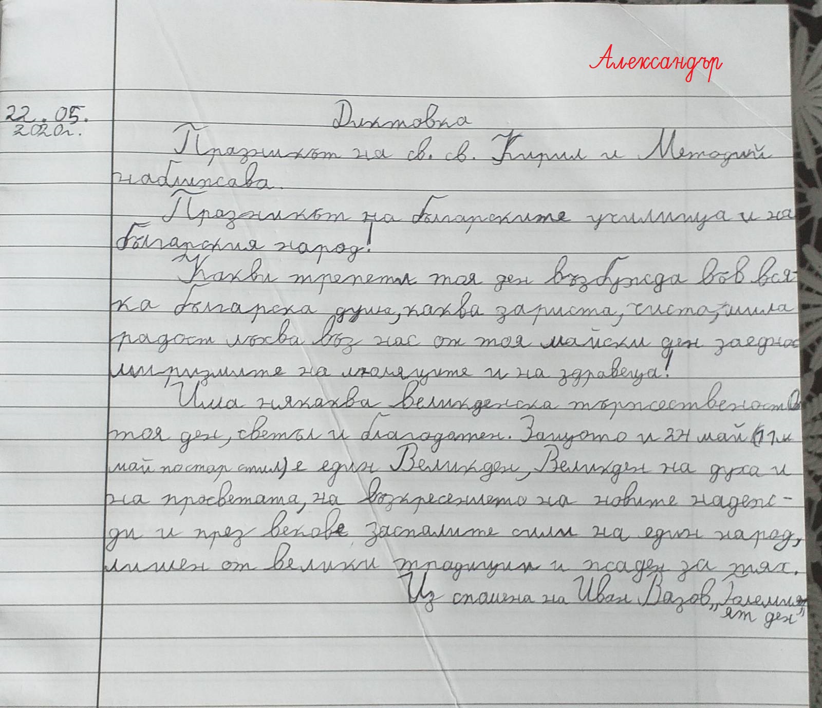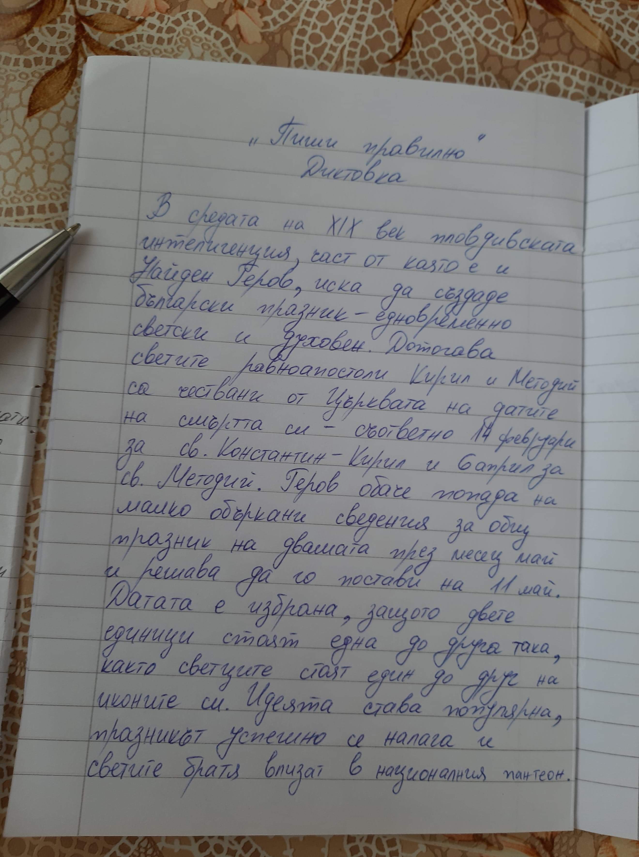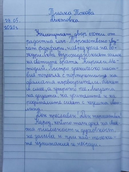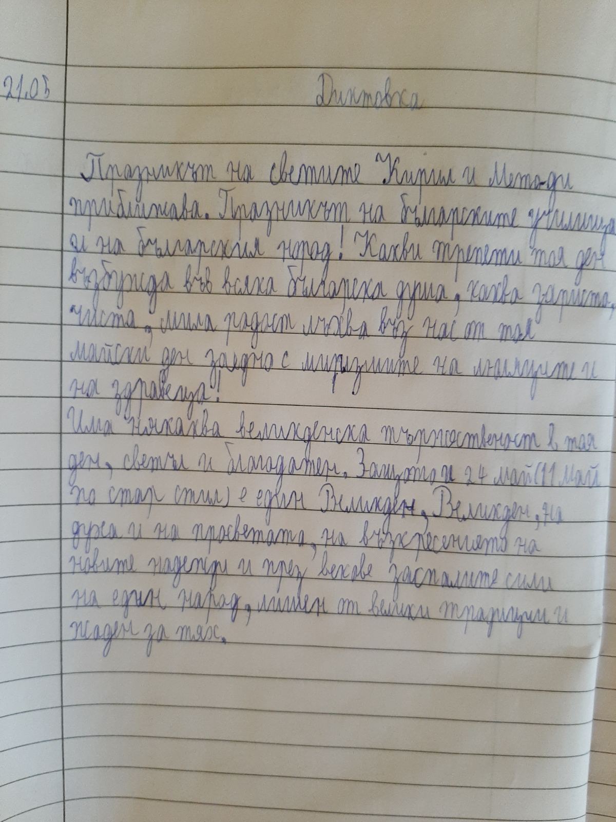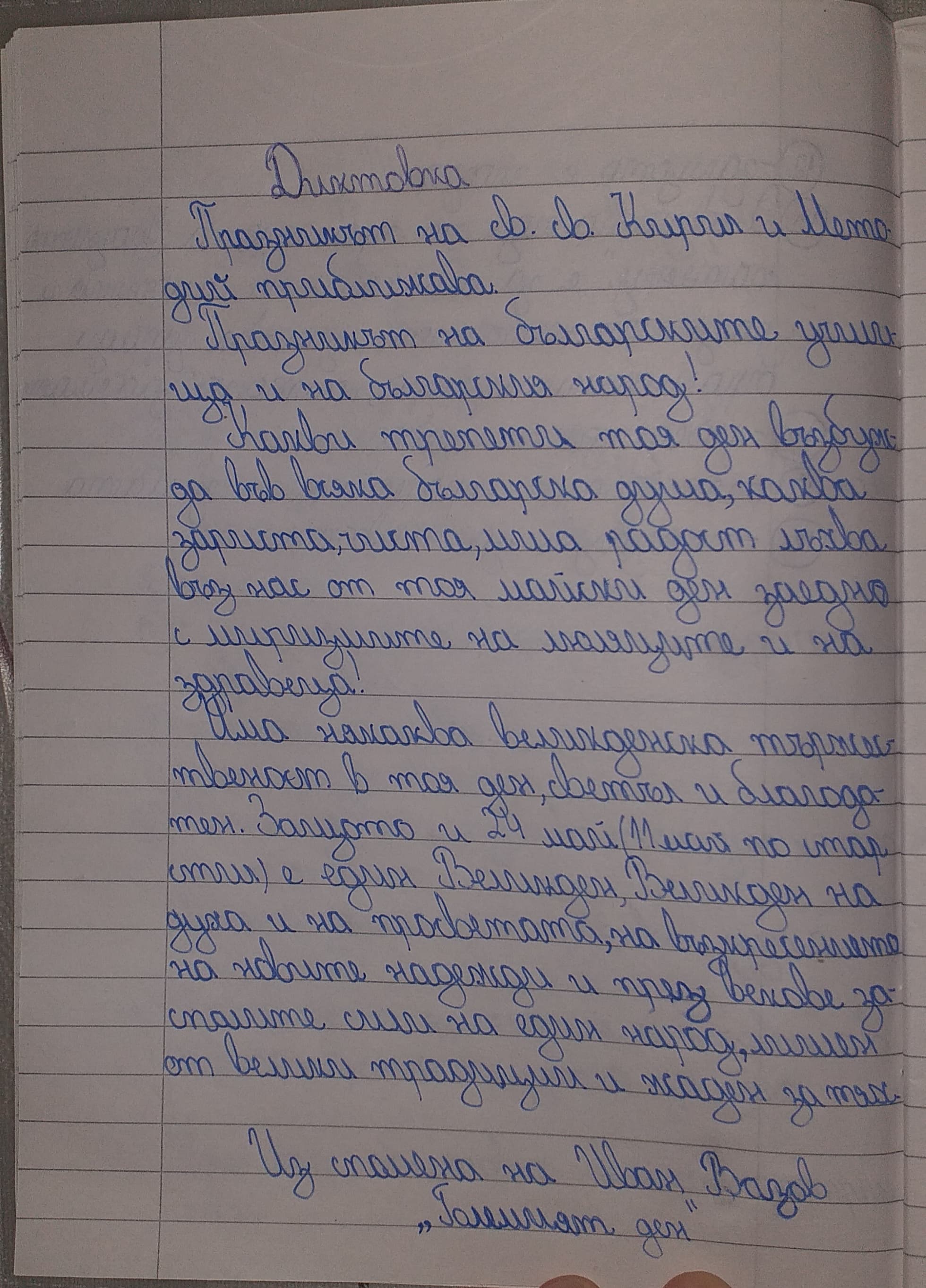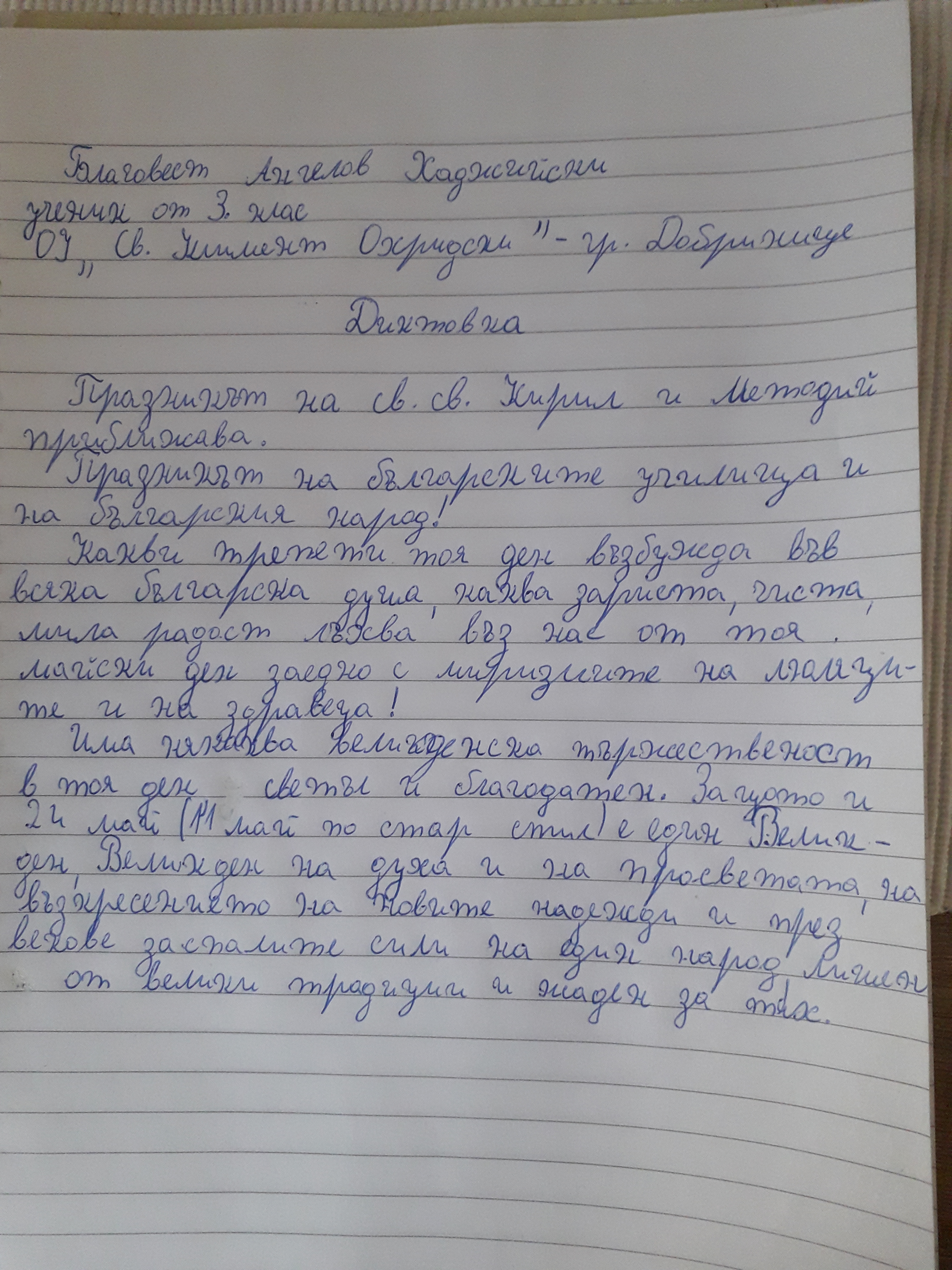 Диктовка по случай 24 май – Деня на българската просвета и култура и на славянската писменост, направи и Тиана Иванова Токова от 2. клас на Средно училище „Йордан Йовков в град Тутракан.