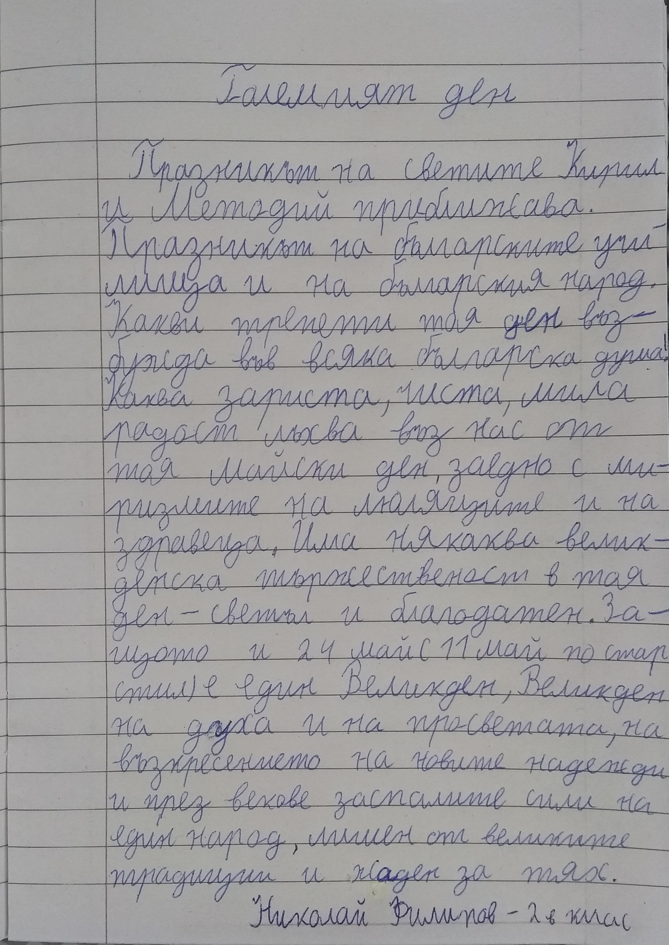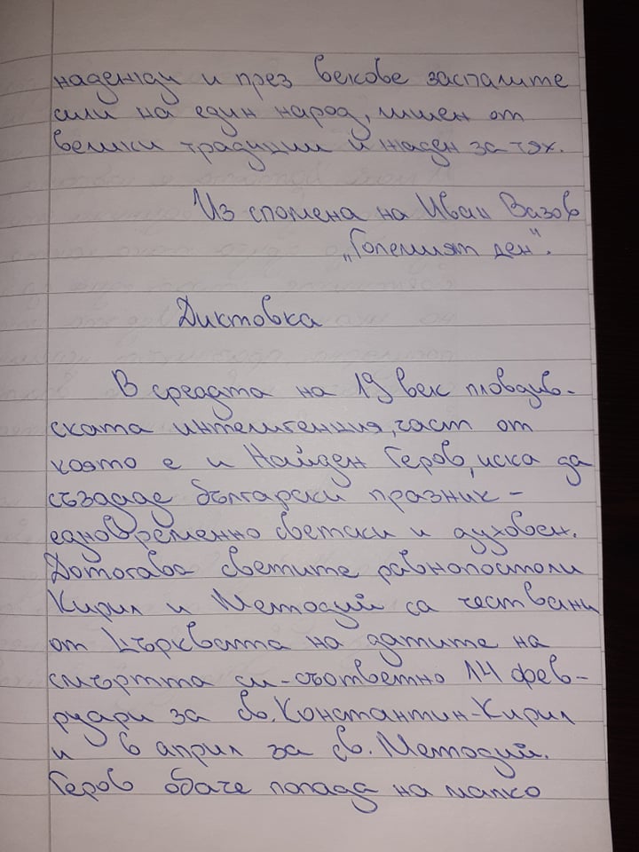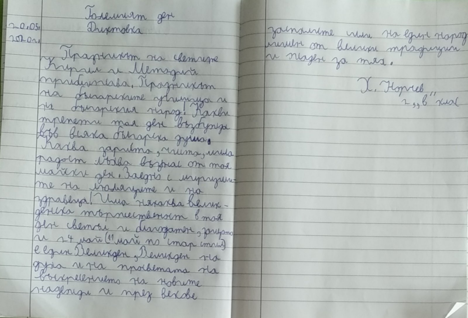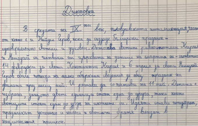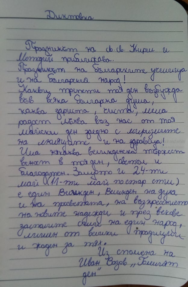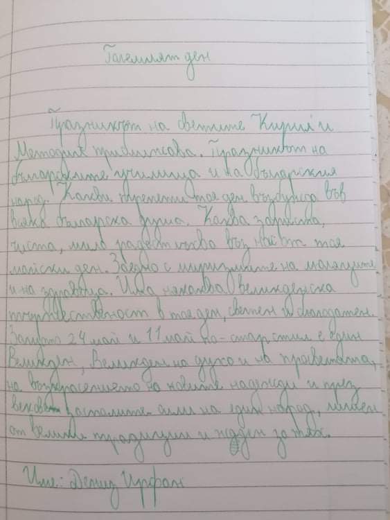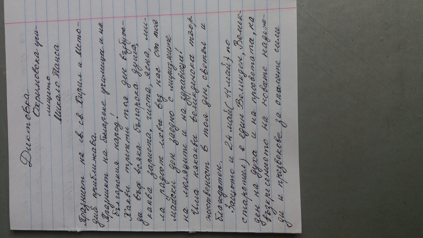 Диктовка по случай 24 май – Деня на българската просвета и култура и на славянската писменост, направи и Тиана Иванова Токова от 2. клас на Средно училище „Йордан Йовков в град Тутракан.