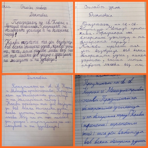 За да изразят почитта си към делото на светите братя Кирил и Методий и желанието си да поддържат любовта към българския език, ученици от 3. клас на Основно училище „Димитър Петров“ в град Сливен писаха диктовка във виртуалната си класна стая, с което се включиха в кампанията „Написаното остава. Пиши правилно!“ на Института за български език.