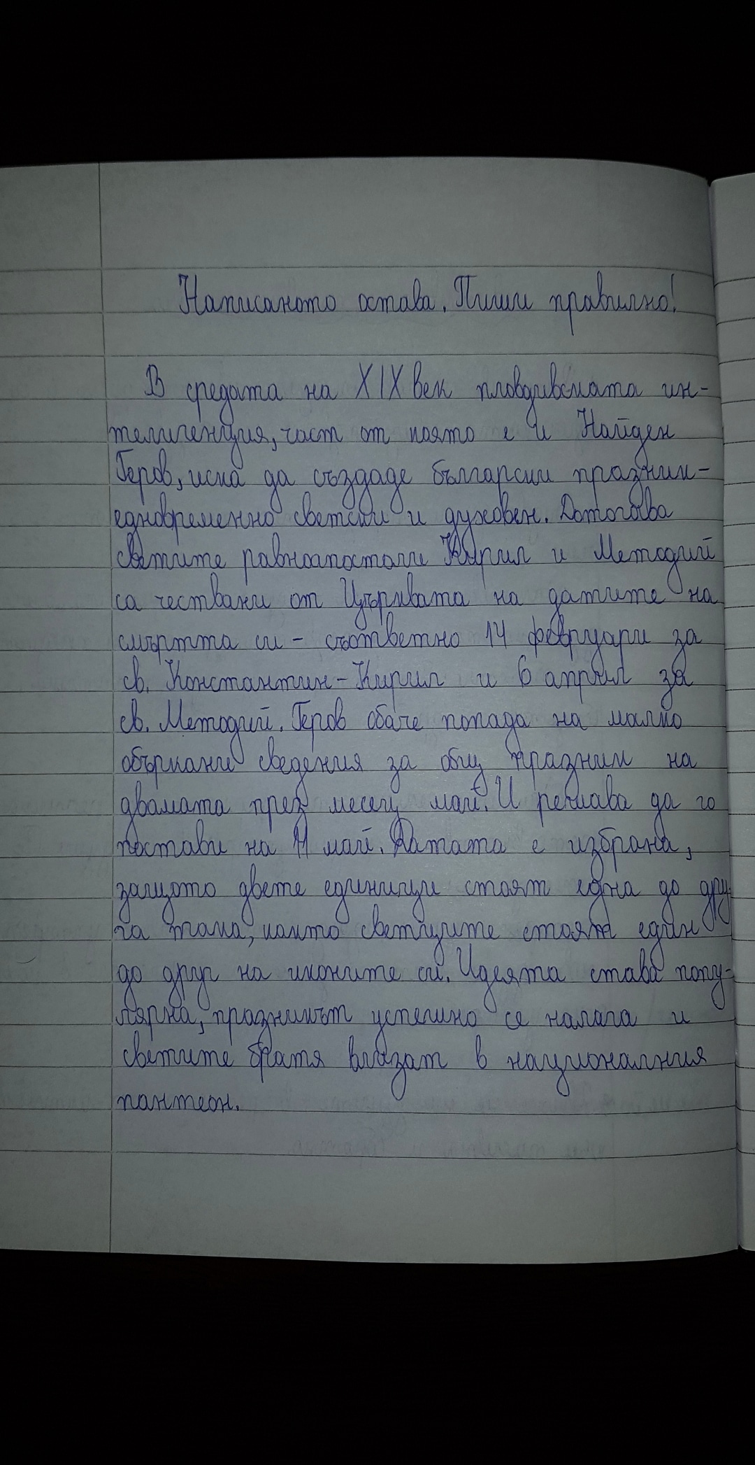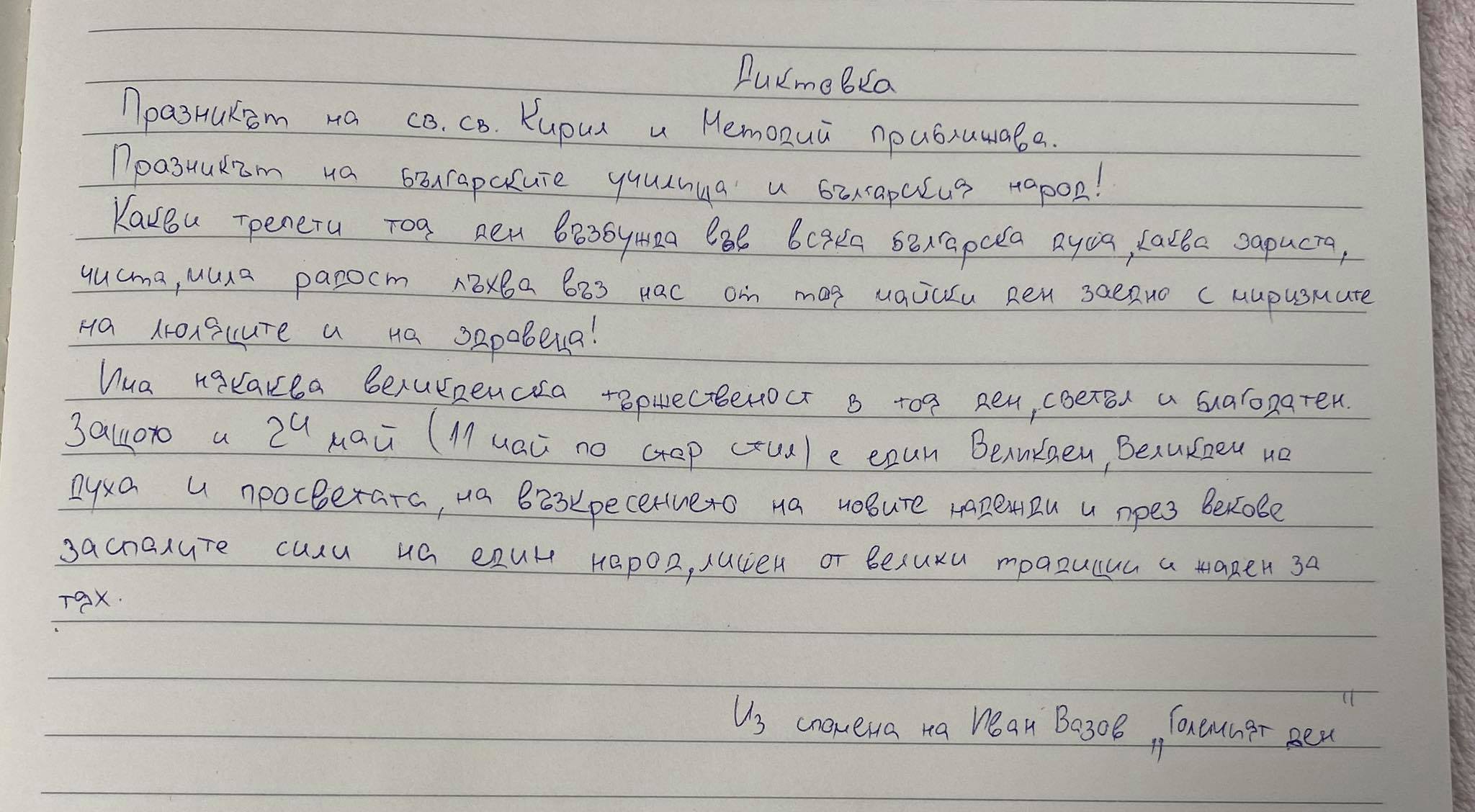 Диктовка в чест на 24 май – Деня на българската просвета и култура и на славянската писменост, направиха и ученици от втори клас при Основно училище „Св. Паисий Хилендарски“, с. Баня, общ. Разлог, с класен ръководител Петранка Цуцуманова.