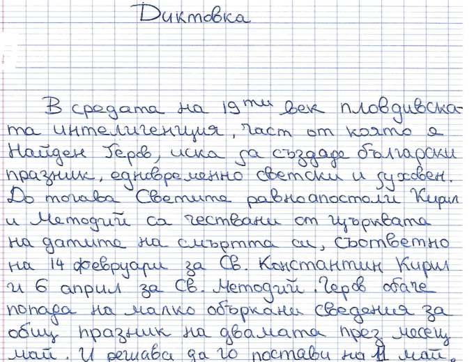 Подготвили сме две диктовки. Едната диктовка (за по-малки ученици) е откъс от спомена на Иван Вазов „Големият ден“. Текстът е нормализиран за целите на диктовката. Другата диктовка (за по-големи ученици) е откъс от статията на Манол Глишев „Как Найден Геров създаде легендата за Солунските братя“, публикувана в интернет сайта „Площад „Славейков“. Направени са редакторски промени за целите на диктовката.
