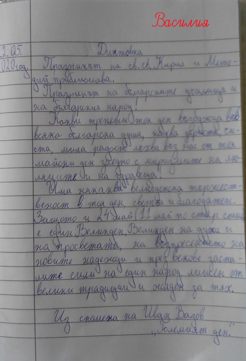 Учениците от 3. клас на 1. основно училище „Св. св. Кирил и Методий“ – гр. Монтана, участваха с ентусиазъм в диктовката в рамките на кампанията „Написаното остава. Пиши правилно!“ в чест на 24 май. И дори и в тази необичайна за всички ситуация малките третокласници се мотивираха и решиха да се включат не само в тази, а и в още няколко инициативи по повод празника.