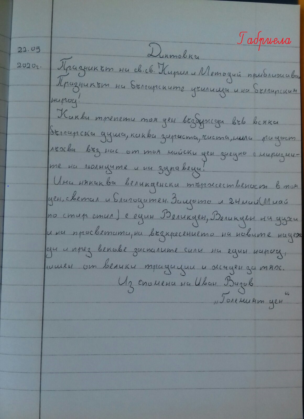 В условията на дистанционно обучение ученици от Основно училище „Найден Геров“, с. Гавраилово, общ. Сливен, се включиха в инициативата „Написаното остава. Пиши правилно!“ по случай 24 май – Деня на българската просвета и култура и на славянската писменост, организирана от Института за български език „Проф. Любомир Андрейчин“ при Българската академия на науките. Взеха участие ученици от 5., 6. и 7. клас, като бяха излъчени най-добрите диктовки.