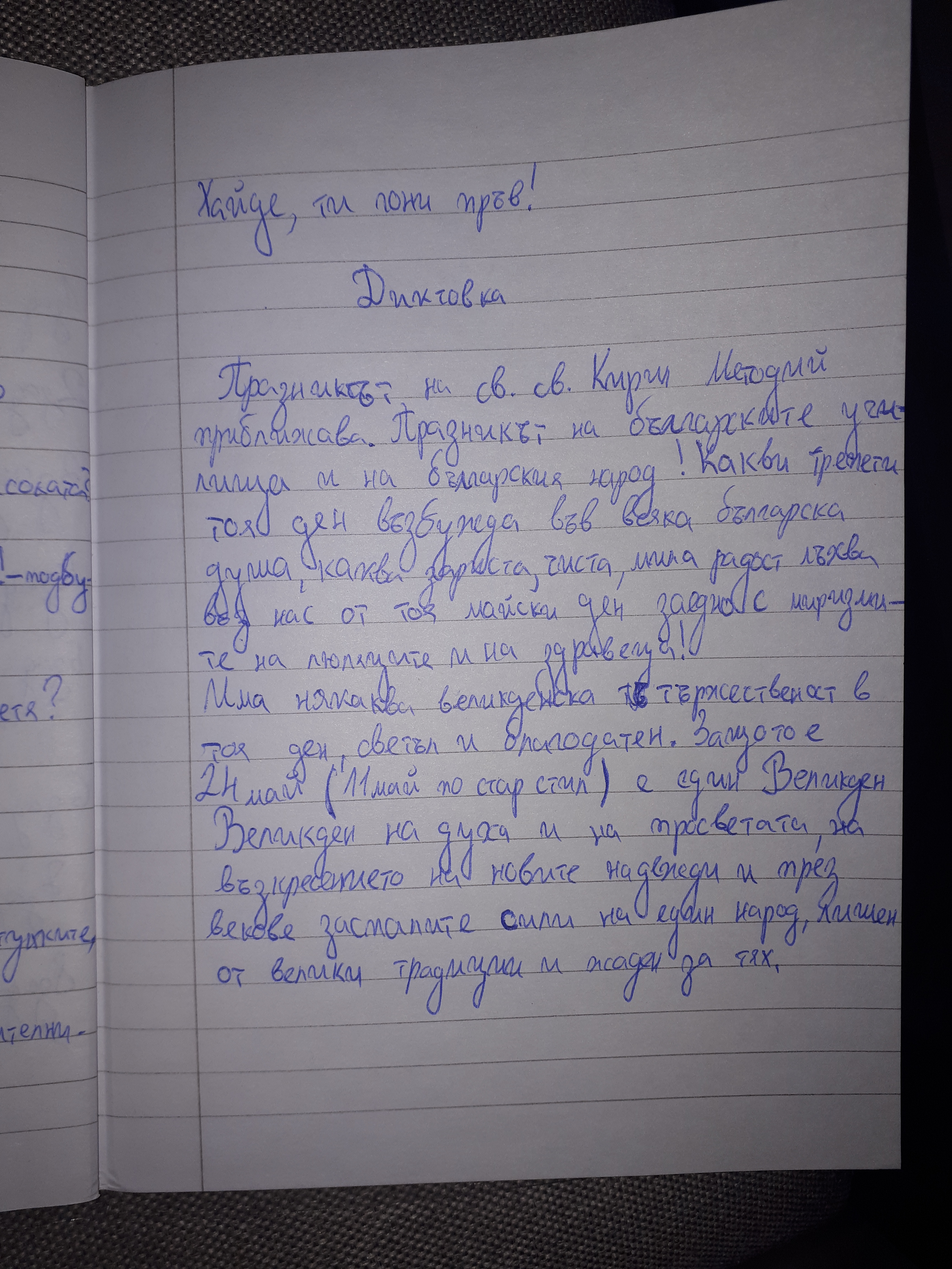 Празнична диктовка по случай 24 май – Деня на българската просвета и култура и на славянската писменост, направиха и учениците от 2. клас при Основно училище „Гео Милев“ в с. Грохотно, общ. Девин, обл. Смолян, с класен ръководител Селвет Къртъл.