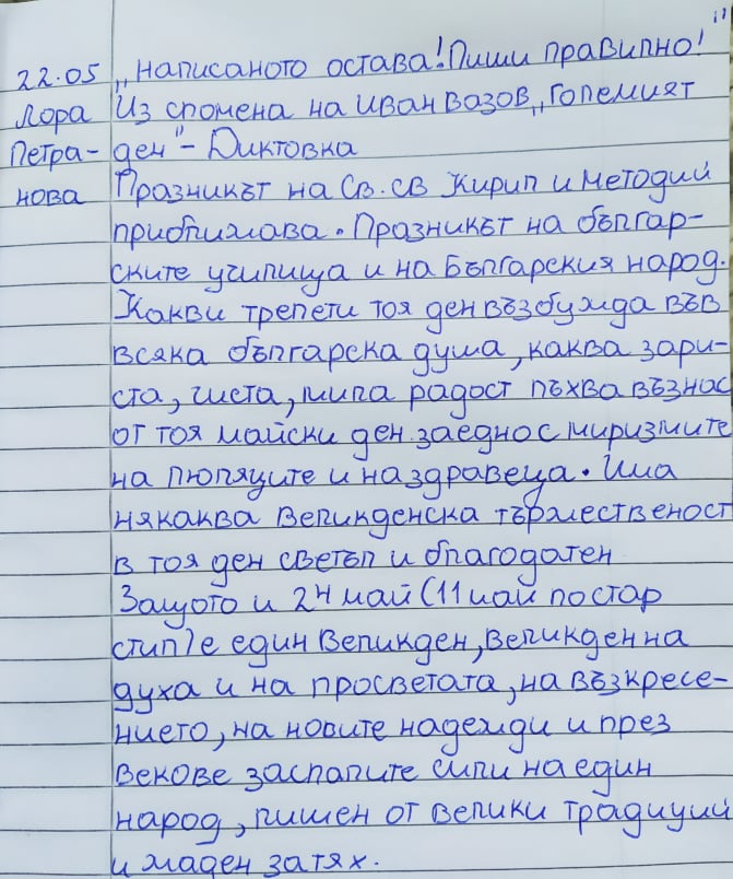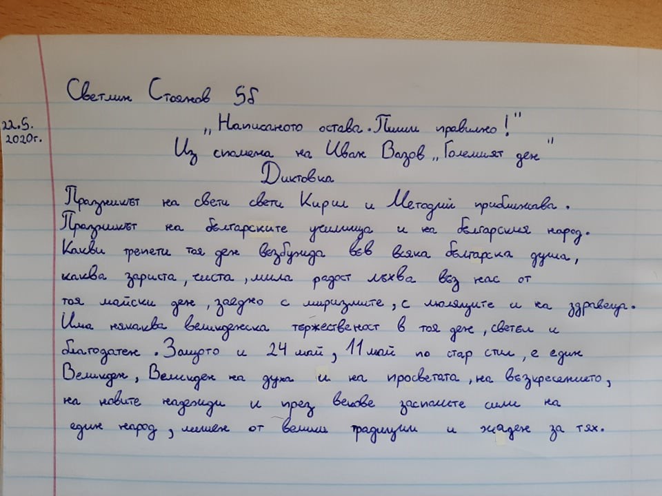 Петокласниците от Основно училище „Иван Вазов“ – с. Любен Каравелово, общ. Аксаково, обл. Варна, се присъединиха към кампанията „Написаното остава. Пиши правилно!“ на Института за български език по случай светлия празник 24 май. С голямо вълнение и огромно желание те направиха диктовката самостоятелно, от своите домове, като използваха аудиофайла, изпратен от учителката им.