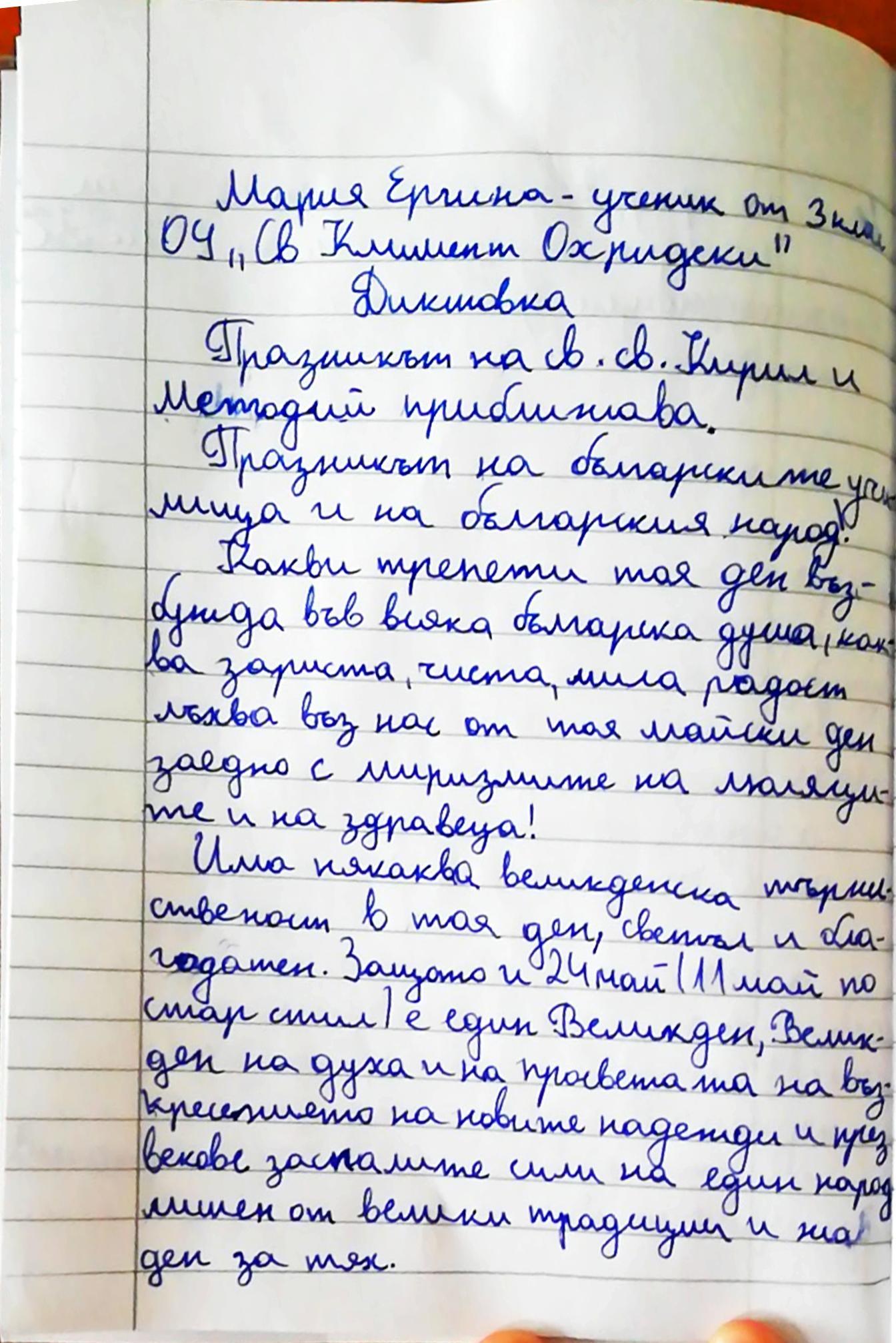 Празнична диктовка в рамките кампанията на Института за български език „Проф. Любомир Андрейчин“ по случай 24 май направи и Елена Чорбаджийска от 4. клас при 3. Основно училище „Димитър Талев“ в град Благоевград.