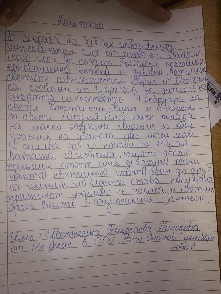 Диктовка по случай светлия празник 24 май – Деня на българската просвета и култура и на славянската писменост, направиха и: Димитър Георгиев от 3. клас на Начално училище „Илия Блъсков“ – гр. Шумен; Божидар Маринов от 4. клас на Основно училище „Екзарх Антим I“ – гр. Сопот; Саша Пеева от 3. клас на Средно училище „Димчо Дебелянов“; Елиф Бедри Дурмуш от 3. клас на Средно училище „Христо Ботев“ – гр. Джебел, общ. Джебел, обл. Кърджали; Себиле Седат Мехмед от 3. клас на Основно училище „Васил Априлов“ – с. Голеш, общ. Кайнарджа, обл. Силистра; Ава Тодорова Мирчева от 3. клас на Основно училище „Св. Паисий Хилендарски“ – гр. Казанлък; Максим Димитров от 2. Клас на Основно училище „Петко Рачов Славейков“ – гр. Пещера; Марая Михайлова от Основно училище „Св. Иван Рилски“ – гр. Перник; Цветелина Иванова от 2. клас на Средно училище „Васил Левски“ – гр. Карлово.