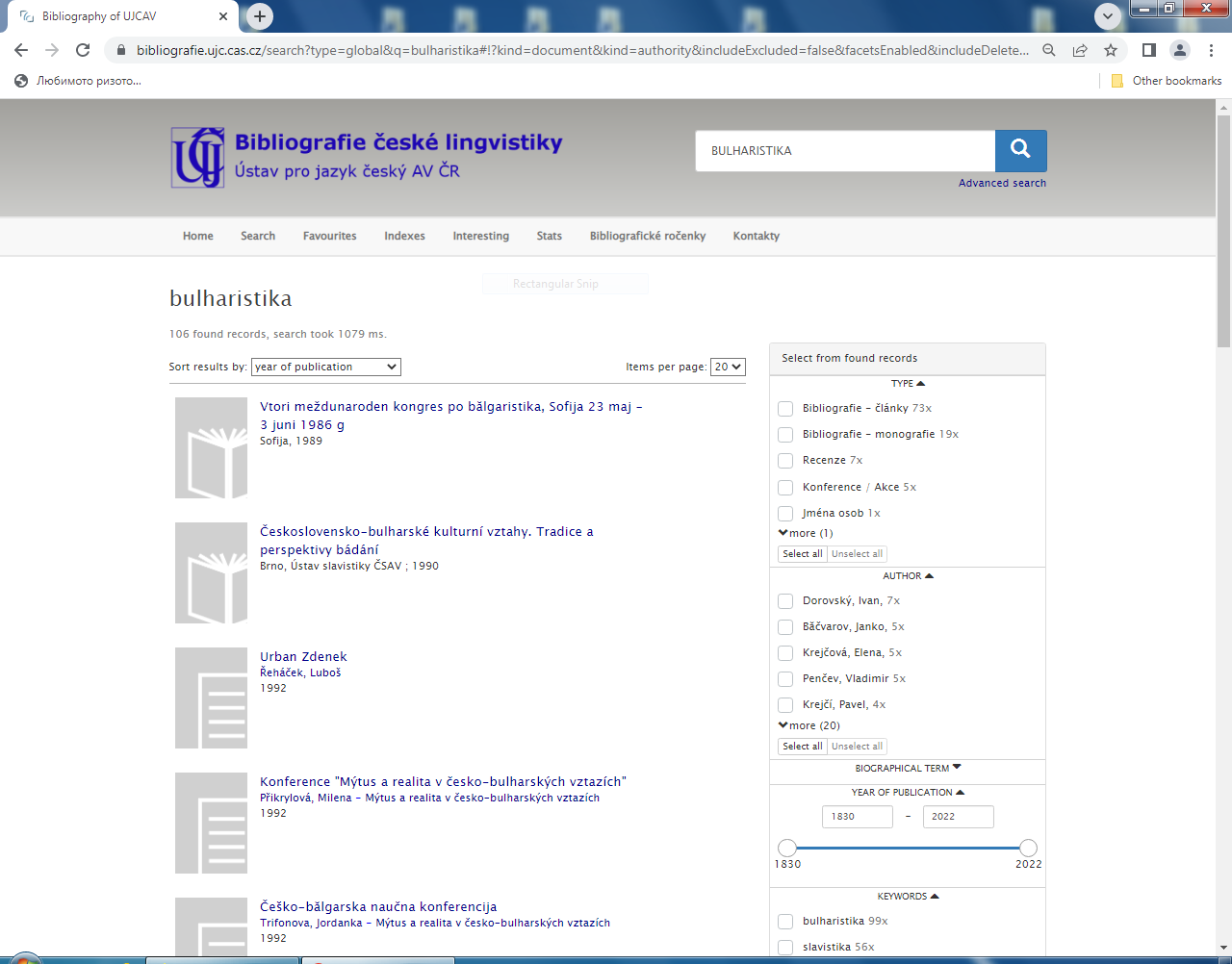 Във връзка с изпълнение на задачата за съставяне на онлайн библиографска платформа Езиковедска българистика – библиография на българската езиковедска литература в рамките на ННП „Българистика“ в началото на м. ноември бяха проведени работни срещи в Института за чешки език при Чешката академия на науките. Със специалистите от Отделението за научна информация на Института за чешки език, което се занимава с библиографско разработване на чешката лингвистична и международната бохемистична продукция, бяха обсъдени теоретични и практически въпроси по създаването на българистичната библиографска платформа. Обсъдено беше и представянето на българското езикознание в чешката и в международната езиковедска библиография. Обмисля се възможността да бъде предоставяна редовно библиографска информация за публикации върху българския език, излезли на чешка територия. Чешките библиографи изразиха пълната си подкрепа относно разработването на новия информационен ресурс в рамките на НПП „Българистика“ и споделиха ценния си опит с българските колеги. Предстои работна среща и с Центъра за литературоведска информация и изследователска инфраструктура „Чешка литературна библиография“ към Института за литература при ЧАН.