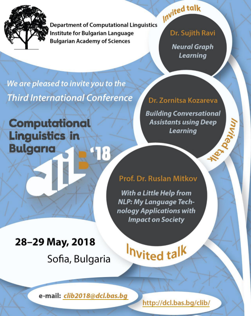 На 28 и 29 май 2018 година в Дома на Европа и сградата на Българската академия на науките в София ще се проведе третото издание на Международната научна конференция „Компютърната лингвистика в България“ (Computational Linguistics in Bulgaria – CLIB 2018). Конференцията си поставя амбициозната задача да подпомогне сътрудничеството между български учени в страната и чужбина, работещи в областта на компютърната лингвистика, и учени, разработващи езикови технологии, приложими за българския език.